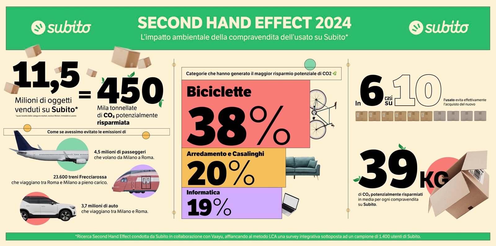 “I risultati dell’analisi Second Hand Effect 2024 dimostrano come la compravendita di oggetti usati non sia solo una scelta consapevole e smart, ma anche un gesto concreto con un impatto ambientale misurabile.” racconta Giuseppe Pasceri, CEO di Subito. “È soddisfacente e stupefacente osservare come quelli che ci sembrano piccoli gesti quotidiani siano in realtà grandi cambiamenti a favore del nostro futuro. L’anno scorso, 11,5 milioni di compravendite su Subito hanno potenzialmente evitato le emissioni equivalenti all’impronta ambientale di 78mila italiani, praticamente l’intera città di Varese!”