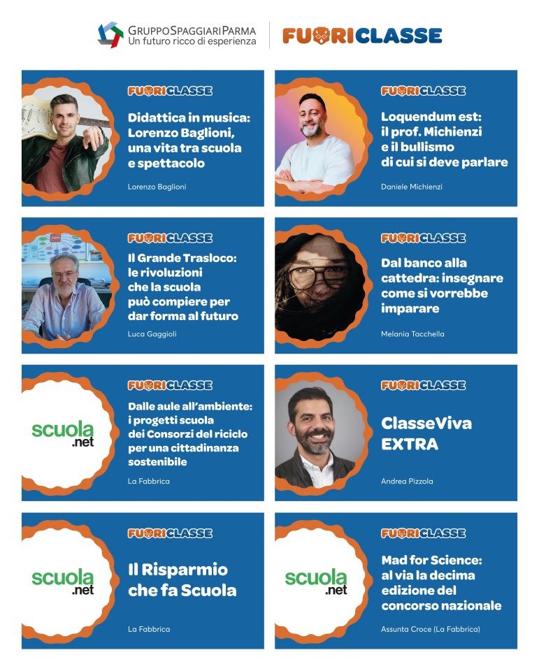 Innovare, condividere, ispirare: con questi obiettivi, torna FuoriClasse, la rassegna ideata da Gruppo Spaggiari Parma per dare spazio alle voci di chi ogni giorno contribuisce a costruire la scuola del futuro. Dal 22 al 24 ottobre 2025, in occasione di Didacta – Edizione Trentino, FuoriClasse ospiterà incontri e dialoghi dedicati alle esperienze più autentiche della scuola che cambia: una scuola capace di rinnovarsi, di dialogare con il territorio e di creare connessioni tra formazione, impresa e società.