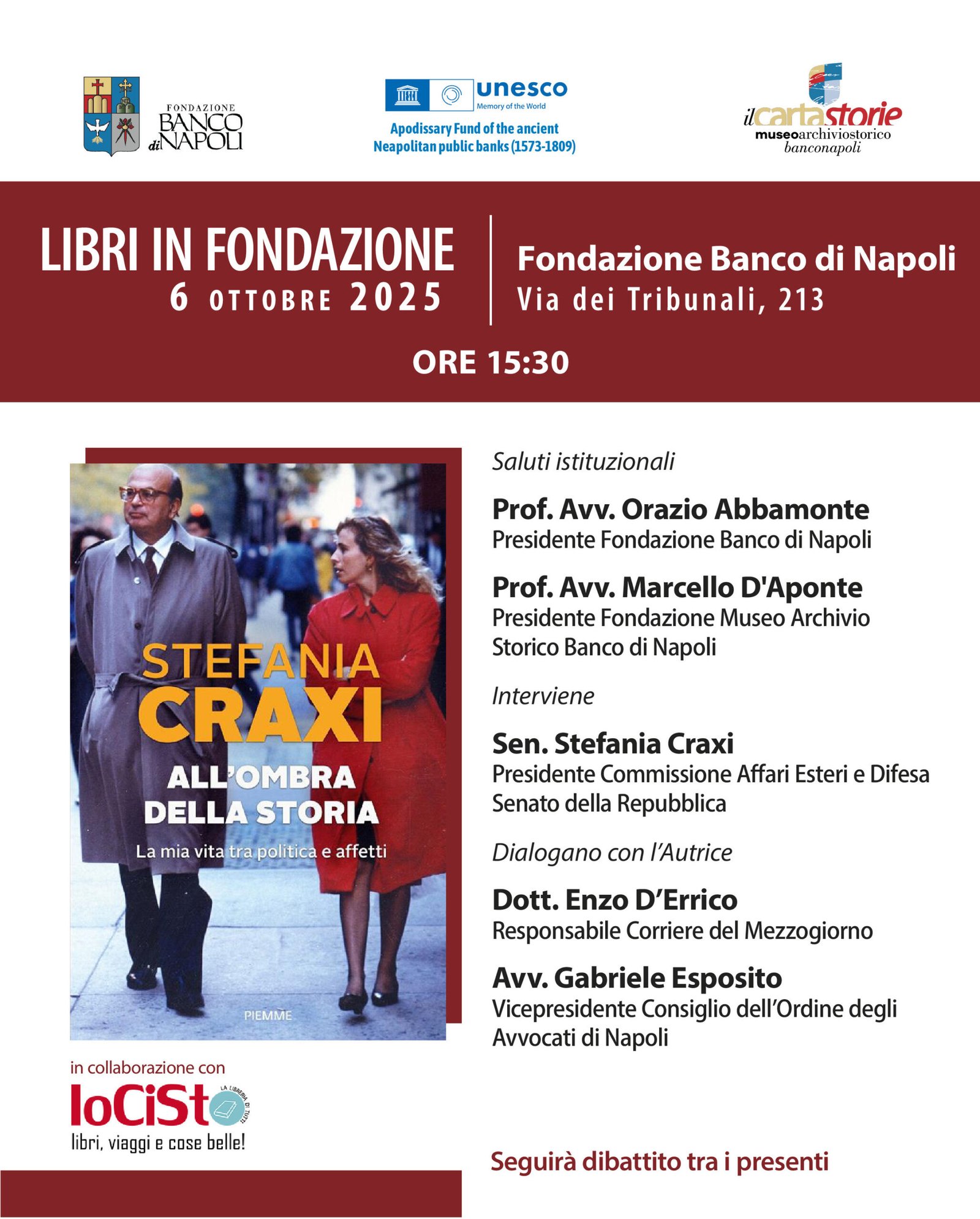 Lunedì 6 ottobre alle 15:30 a Palazzo Ricca, sede della Fondazione Banco Napoli (via dei Tribunali, 213) è in programma la presentazione del libro di Stefania Craxi All’ombra della storia, La mia vita tra affetti e politica, memoriale di una figlia che racchiude l’eredità di un pensiero e di una cultura politica. Partecipano Orazio Abbamonte Presidente della Fondazione, Marcello D’Aponte Presidente Fondazione Museo Archivio Storico Banco di Napoli, Enzo D’Errico Responsabile Corriere del Mezzogiorno, Gabriele Esposito Vicepresidente Consiglio dell’Ordine degli Avvocati di Napoli, in collaborazione con la libreria loCiSto. «Questo volume nasce da un moto dell’animo. Racconta un pezzo della mia storia – commenta Stefania – il mio Craxi, un padre difficile e straordinario, e, vagando tra i ricordi, narra le vicende della nostra famiglia, una famiglia allargata a una piccola, grande comunità politica e di amici che per anni ha condiviso tutto.» Per la prima volta, la senatrice, figlia di Bettino, decide di raccontare una storia politica di cui va fieramente orgogliosa. Nelle sue riflessioni non c’è solo il ricordo affettuoso del politico esuberante e sognatore, ostinato e tenace che era suo padre, ma il racconto di un intero Paese in grande trasformazione, pieno di energie e rancori mai sopiti. Uomini e donne, protagonisti e comparse di un’epoca che non tornerà; i pochi che le sono stati vicino e i molti che si sono girati dall’altra parte nei periodi più bui; pagine straordinarie, e a volte dolorose, della storia recente italiana. «La mia prima vita, che racconto in questo libro – spiega – non contemplava il palcoscenico, ma semmai il dietro le quinte, lo stare fuori dallo schermo, mai davanti. E, soprattutto, non prevedeva, neanche per sogno, la politica come impegno quotidiano. Ma nessuno ci chiede cosa vogliamo: la volontà si scontra con il senso del dovere, del dover agire e del dover fare, del dover dire e del dover esserci. È questo l’insegnamento che ho tratto vivendo all’ombra della Storia. Non ne ho fatto parte, forse solo in determinati frangenti, in alcuni casi comici e in altri tragici, ma sono mio malgrado una testimone. E oggi, raggiunta l’età della maturità, l’età in cui si riflette e si guarda al passato, vedo scorrere davanti ai miei occhi dei fotogrammi, che mi fanno capire quanto sia distante quel tempo passato e quanto, per molti versi, quel tempo sembra non passare.»