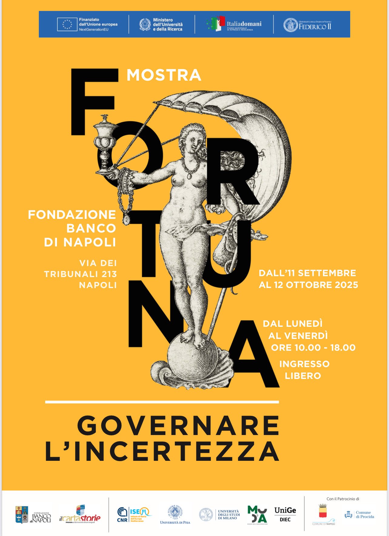 Una mostra che invita il pubblico a riflettere su come l’uomo, dal passato al presente, abbia cercato di affrontare ciò che non può controllare. Giovedì 11 settembre alle 11 a Palazzo Ricca (via dei Tribunali, 213), inaugura l’esposizione Fortuna. Governare l’incertezza, a cura del Dipartimento di Scienze Economiche e Statistiche dell’Università Federico II di Napoli, dell’Istituto di Storia dell’Europa Mediterranea del CNR e della Fondazione Banco Napoli. Il percorso espositivo prende avvio da un episodio reale: il naufragio del capitano Michele Grimaldi di Procida nel 1859, tratto da un testimoniale marittimo e da un ex-voto conservato a Procida. Da qui si dipana una narrazione che attraversa i diversi modi con cui le società hanno tentato di governare l’incertezza: dalle pratiche divinatorie e religiose alle strategie dei navigatori, fino ai calcoli degli assicuratori e alla nascita della probabilità statistica. Il visitatore si trova immerso nell’esperienza di una tempesta di mare attraverso l’installazione sonora dell’artista e compositore Roberto Pugliese e le proiezioni di Lukas Sander. Documenti d’archivio, testimonianze materiali e riflessioni contemporanee si intrecciano per mostrare come la “fortuna”, ieri come oggi, resti una forza viva che condiziona le scelte individuali e collettive. Un viaggio tra memoria storica e attualità, per comprendere come, nonostante secoli di progresso scientifico, l’uomo si trovi nuovamente di fronte a un’incertezza che sfugge ai modelli matematici. Dal rischio marittimo del XIX secolo alle crisi sistemiche del XXI, il filo rosso è lo stesso: l’uomo che cerca di dare un senso all’imprevedibile. «La “dea fortuna” – commentano i promotori – personificazione di quegli elementi della natura e della vita umana che sfuggono al controllo della volontà o della ragione, in cui dominano avventura, rischio, incertezza e irrazionalità, sembra tornare protagonista nel mondo contemporaneo, segnato da crisi climatiche, finanziarie, belliche e tecnologiche, dove l’incertezza riconquista un ruolo centrale nelle nostre vite». Il progetto è a cura di Simona Morini, le opere in mostra sono di Jacques Perconte, Roberto Pugliese, Francesco Santosuosso, allestimento di Lukas Sander e Klaus Mussen. Comitato scientifico: Giovanni Ceccarelli, Maria Carmela Schisani, Andrea Addobbati, Paola Avallone, Luisa Piccinno, Gea Palumbo e Raffaella Salvemini. La mostra visitabile dal lunedì al venerdì (dalle 10 alle 18) fino al 12 ottobre, ingresso libero, è realizzata nell’ambito dei progetti PRIN 2022. Under Uncertainty. Coping with risks in the Mediterranean Maritime Business CUP D53D230006; PRIN PNRR 2022 WWS (Winds, Waves and Storms): historical data and modern quantitative approaches to uncover the long-term strategies to prevent and mitigate climate risks in the European seas (15th-19th centuries) CUP E53D2302015001.