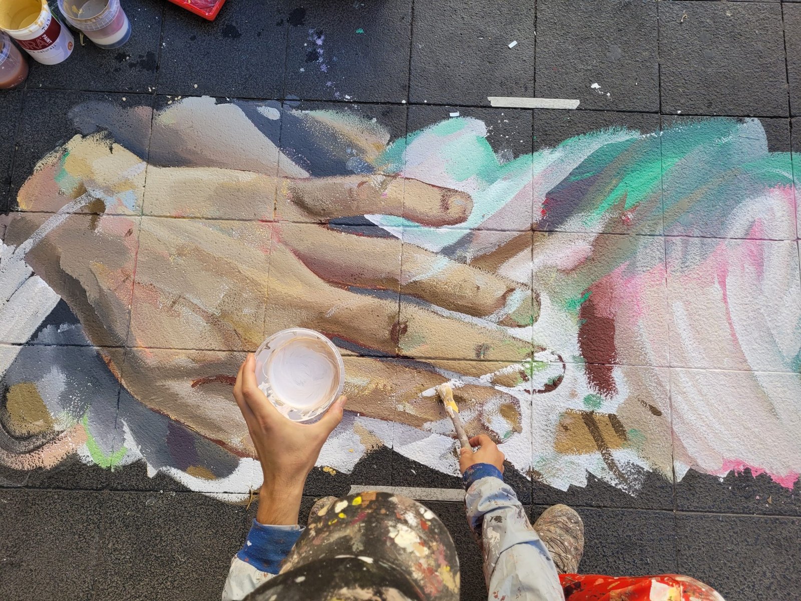 Guido Palmadessa Street artist argentino, tra i più famosi al mondo, si è messo all’opera per realizzare graffiti a pavimento in giro per le strade di Napoli. Prima tappa, via Duomo, dove ha realizzato una gigantesca mano colorata a rappresentare il contatto fisico, un invito a vivere e a recuperare il rapporto con le persone, a ritrovare la vicinanza”.