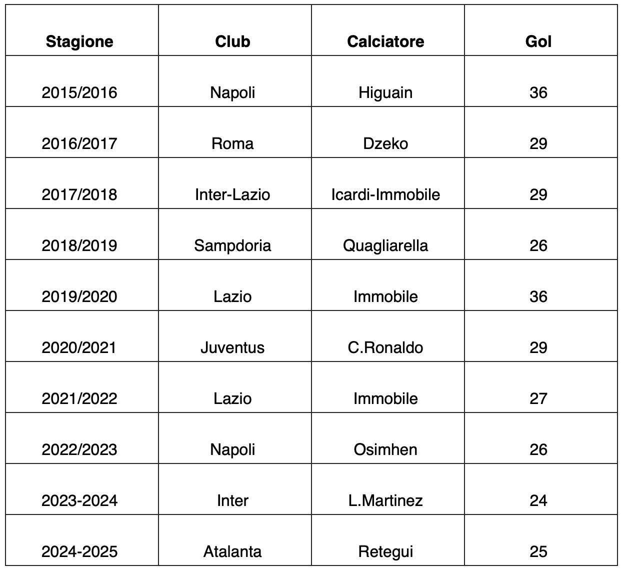 Di seguito la panoramica dei capocannonieri delle ultime 10 stagioni di Serie e il numero delle rispettive reti siglate: