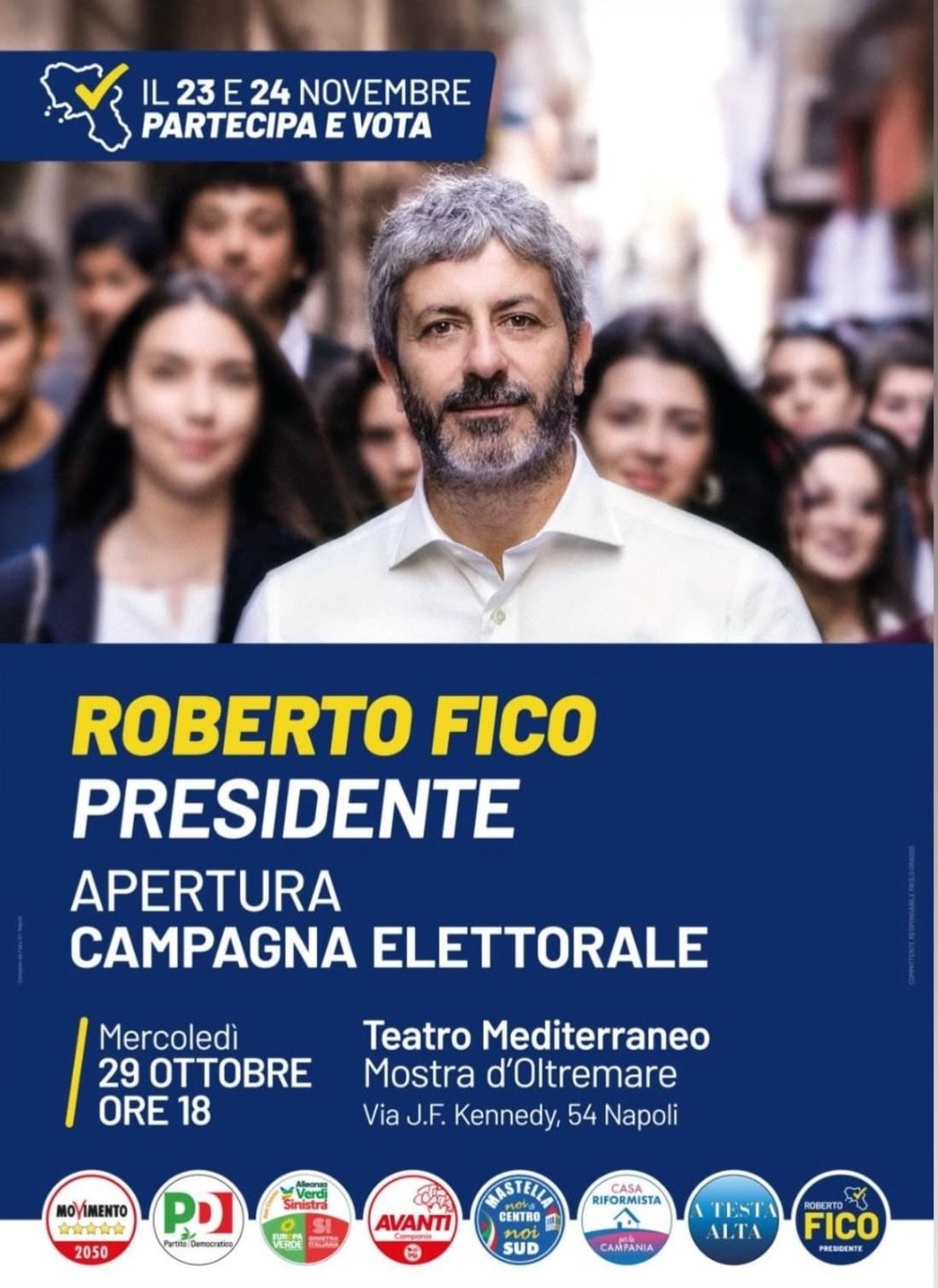 CAMPANIA. A meno di un mese dall’elezione regionale del 24 e 25 novembre della nostra Regione, apre la campagna elettorale il candidato Presidente del Centro-Sinistra Roberto Fico, ex Presidente della Camera dei Deputati iscritto al Movimento 5 Stelle.