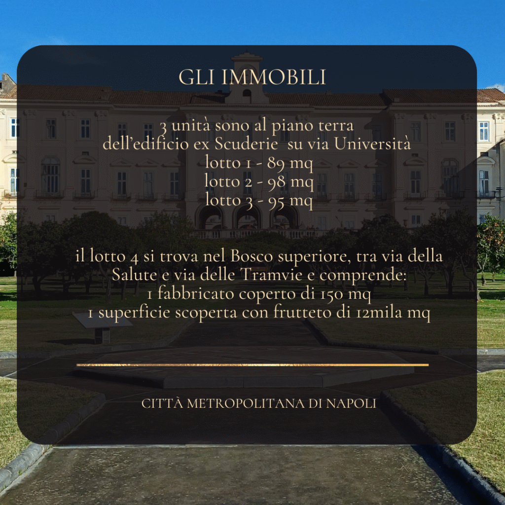 Gli immobili messi a bando, attualmente liberi e inutilizzati, sono stati dichiarati di interesse artistico-storico ai sensi del D.Lgs. 42/2004 dalla Commissione Regionale per il Patrimonio Culturale della Campania. Tre unità sono collocate al piano terra dell’edificio ex Scuderie su via Università (lotti 1, 2 e 3), mentre il quarto immobile (lotto 4) si trova nel Bosco superiore, all’angolo tra via della Salute e via delle Tramvie, e comprende un fabbricato con antiche vasche borboniche e un terreno agricolo di oltre 12.000 mq coltivato a uliveto e frutteto.