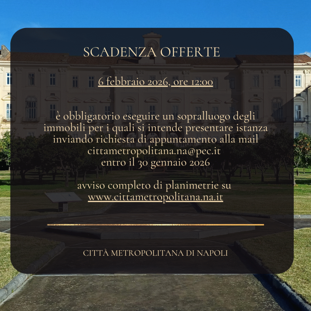 Le offerte dovranno pervenire entro le ore 12:00 del 6 febbraio 2026. La selezione avverrà secondo il criterio dell’offerta economicamente più vantaggiosa, con valutazione sia dell’offerta tecnica che dell’offerta economica. È obbligatorio eseguire un sopralluogo degli immobili per i quali si intende presentare istanza inviando richiesta di appuntamento alla mail cittametropolitana.na@pec.it entro il 30 gennaio 2026.