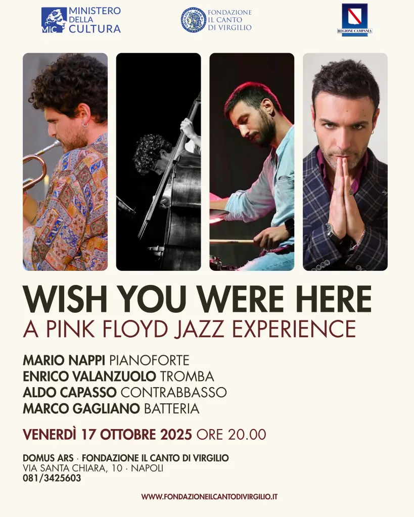 17 ottobre – Wish You Were Here – A Pink Floyd Jazz Experience con Enrico Valanzuolo (tromba), Mario Nappi (pianoforte), Aldo Capasso (contrabbasso) e Marco Gagliano (batteria) – inizio ore 20 presso Domus Ars.