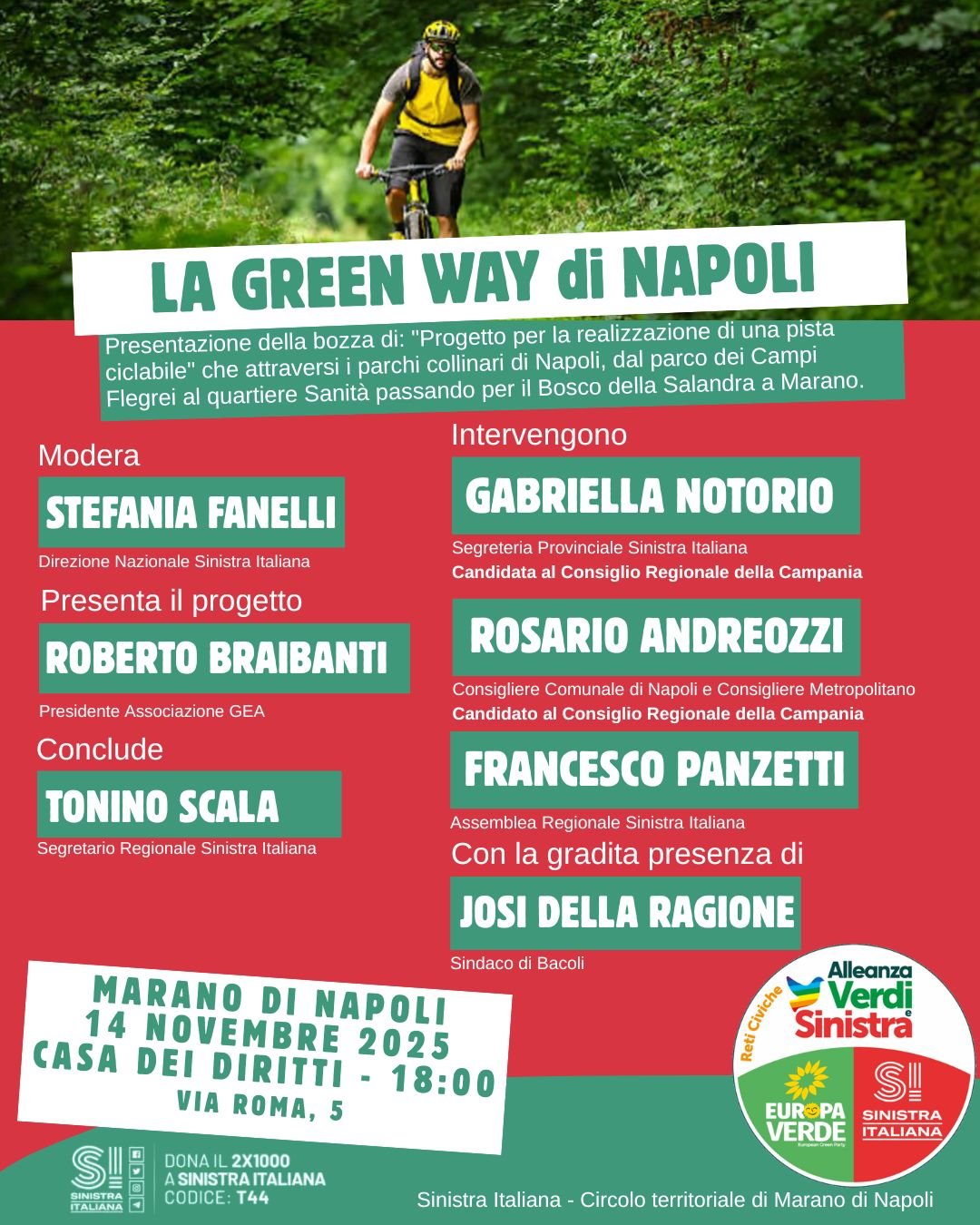 Il progetto GreenWay nasce come proposta concreta, presentata da diverse associazioni ambientaliste, per un nuovo modello di sviluppo sostenibile: una pista ciclabile che colleghi i parchi naturali, partendo dai Campi Flegrei fino al Vallone di San Rocco, passando per Marano e attraversando il Bosco della Salandra, cuore verde del nostro territorio.