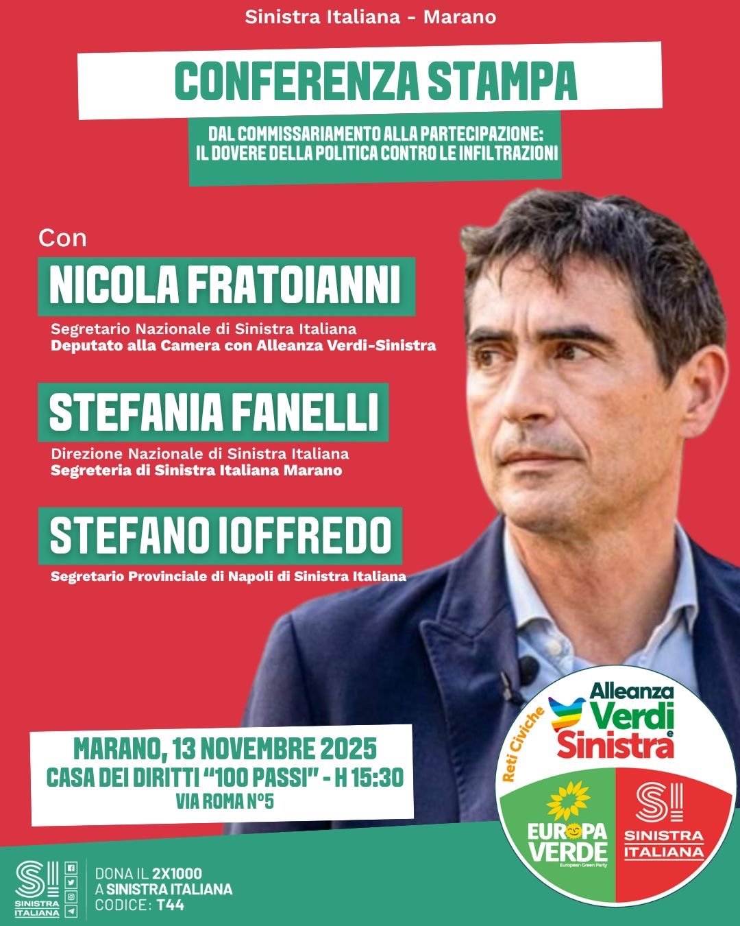 Marano: Giovedì 13 novembre, alle ore 15.30, presso la sede “Casa dei Diritti Cento Passi” in Via Roma n. 5 Marano di Napoli, si terrà una conferenza stampa con Nicola Fratoianni, segretario nazionale di Sinistra Italiana e deputato di Alleanza Verdi e Sinistra.
