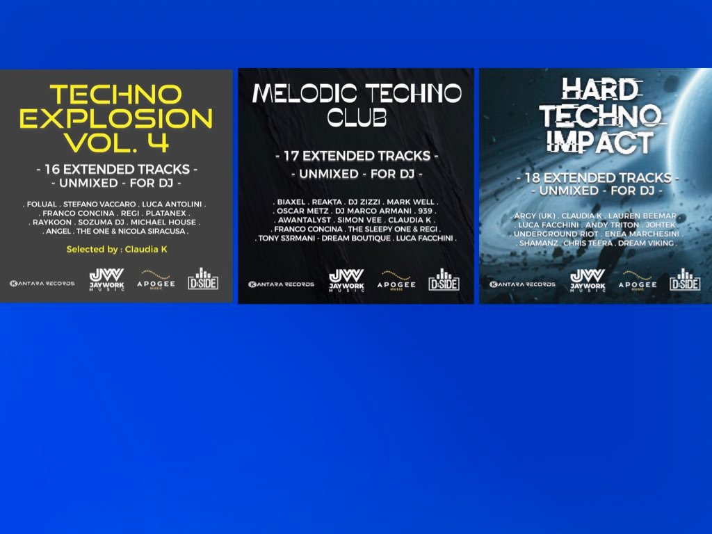 Jaywork Music propone 3 scatenate compilation elettroniche: Melodic Techno Club, Hard Techno Impact, Techno Explosion Vol. 4. Tante tracce, tutte non mixate, pronte per i DJ set di professionisti e giovani selezionatori di tutto il mondo… in puro stile Jaywork, ovvero grande musica, artisti d’eccellenza e tanti nuovi talenti.