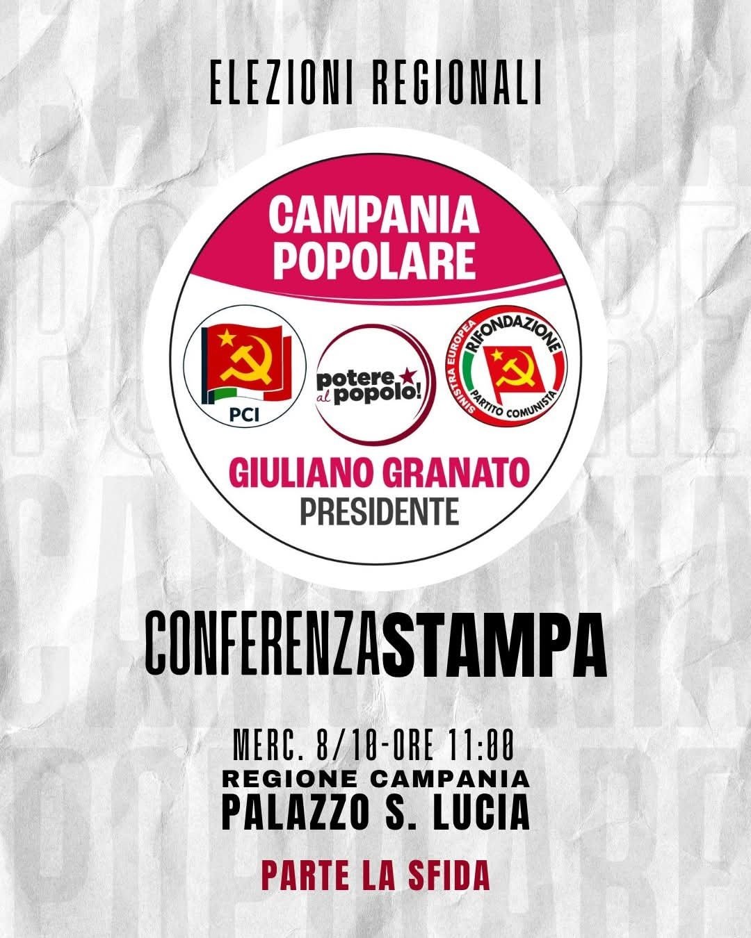 Mercoledì 8 ottobre alle 11:00, davanti alla sede della Regione Campania di via Santa Lucia (Napoli), la lista “Campania Popolare” presenta il simbolo e la candidatura a presidente di Giuliano Granato, per le elezioni regionali del 23 e 24 novembre.