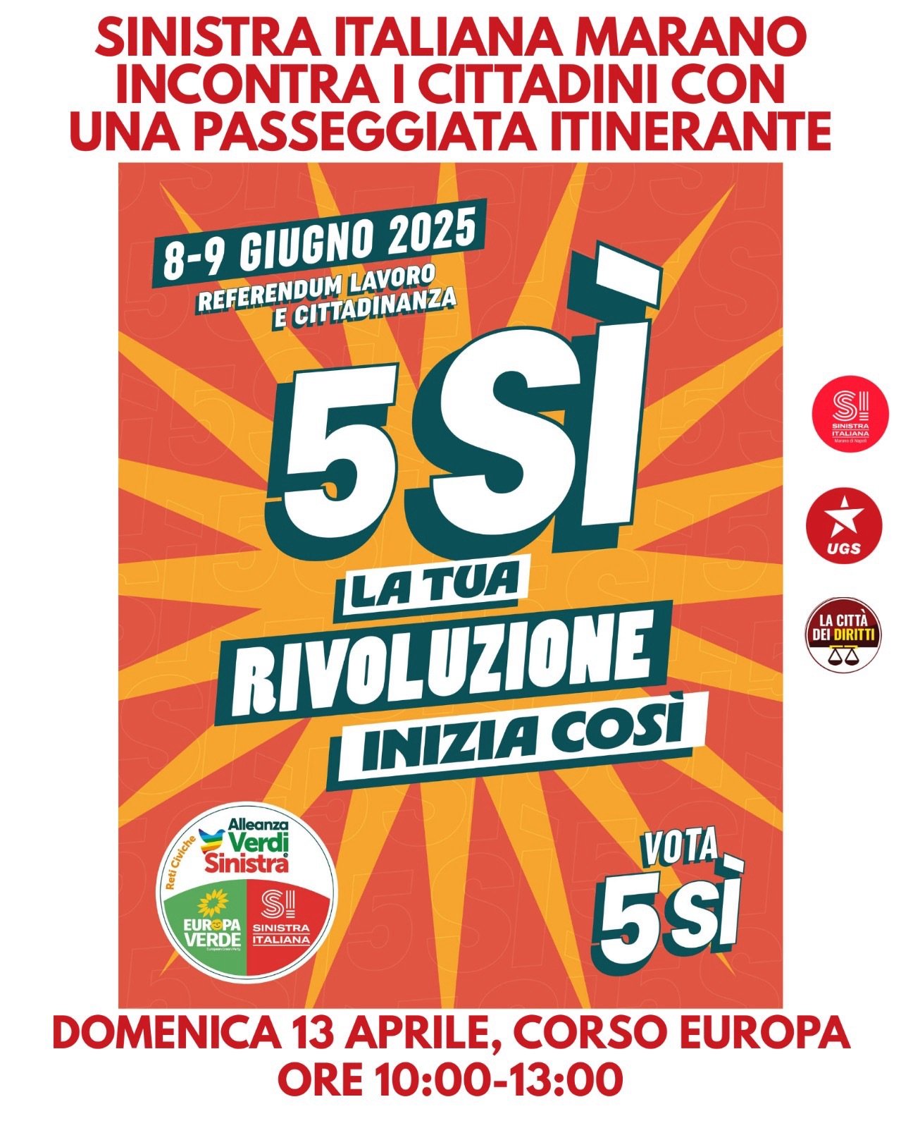 Marano: Domenica 13 aprile dalle 10 alle 13 al Corso Europa incontreremo le cittadine ed i cittadini , in una passeggiata itinerante, per spiegare loro l’ importanza di questo referendum .