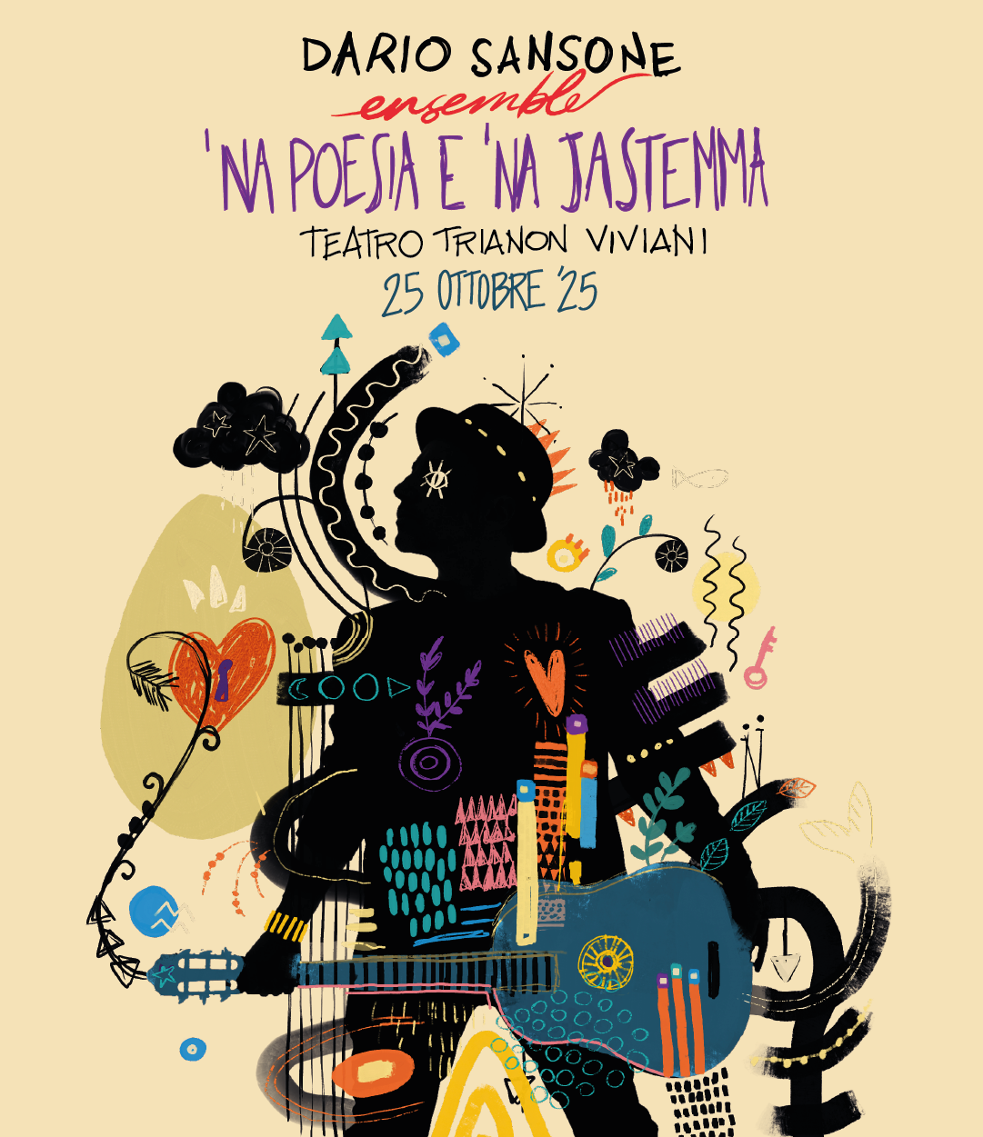 Dopo il grande successo riscosso nel 2024, Dario Sansone, una delle voci più autentiche e rappresentative della nuova scena musicale napoletana, torna sul palco del Teatro Trianon Viviani in una data speciale. Sabato 25 Ottobre (ore 21), con il suo Ensemble, presenterà “Na poesia e na jastemma”, un live show che si conferma come un evento imperdibile, a metà strada tra il concerto e il racconto teatrale.