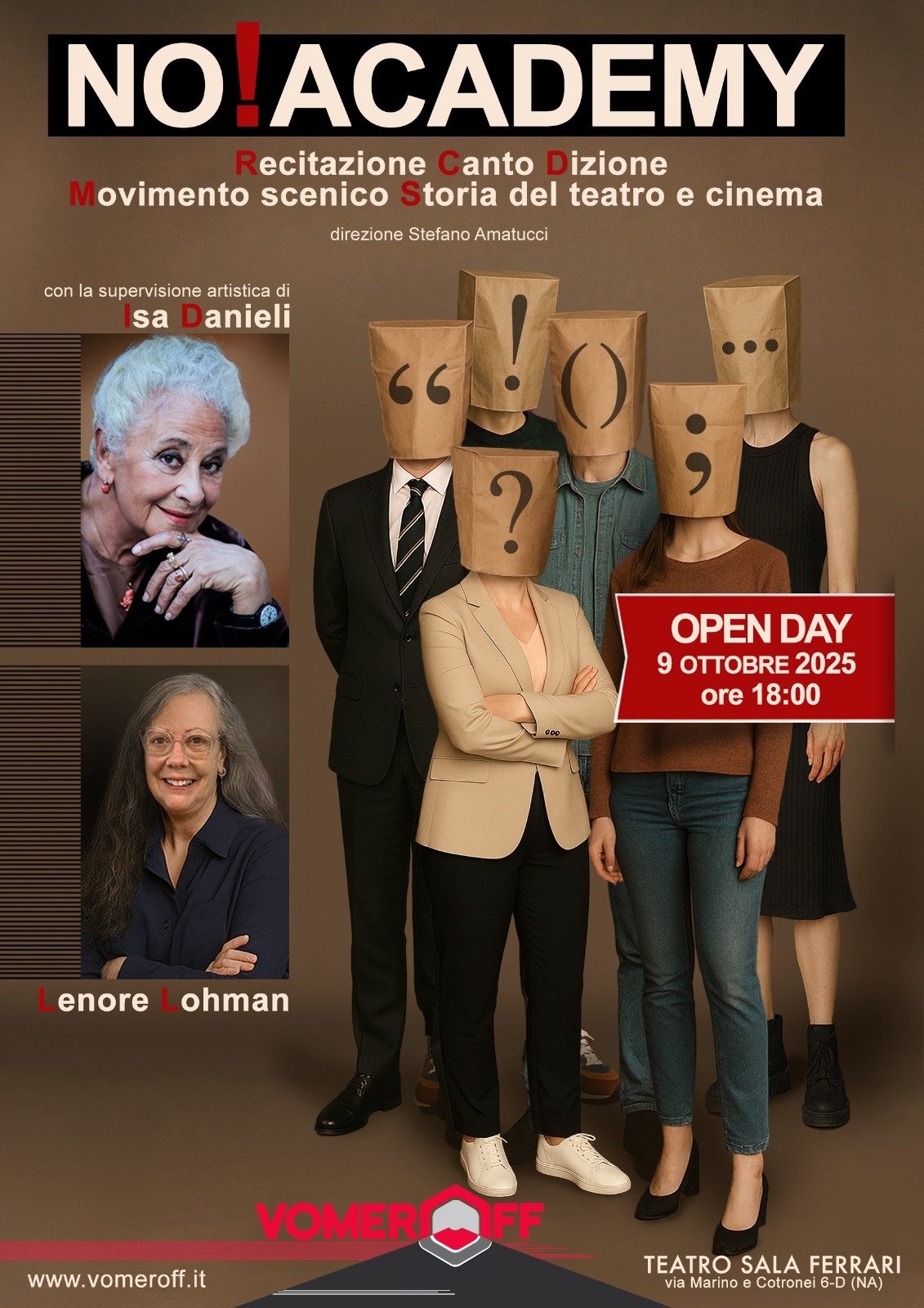 L’Associazione Vomeroff propone un nuovo open day, il 9 ottobre alle ore 18 presso il Teatro Sala Ferrari, per presentare al pubblico la «No! Academy», percorso di alta formazione teatrale e audiovisiva. L’Accademia, diretta dal noto regista Stefano Amatucci, si distingue per un approccio pratico e rigoroso, con la supervisione artistica di due nomi d’eccellenza: l’attrice italiana Isa Danieli e l’acting coach newyorkese Lenore Lhoman.