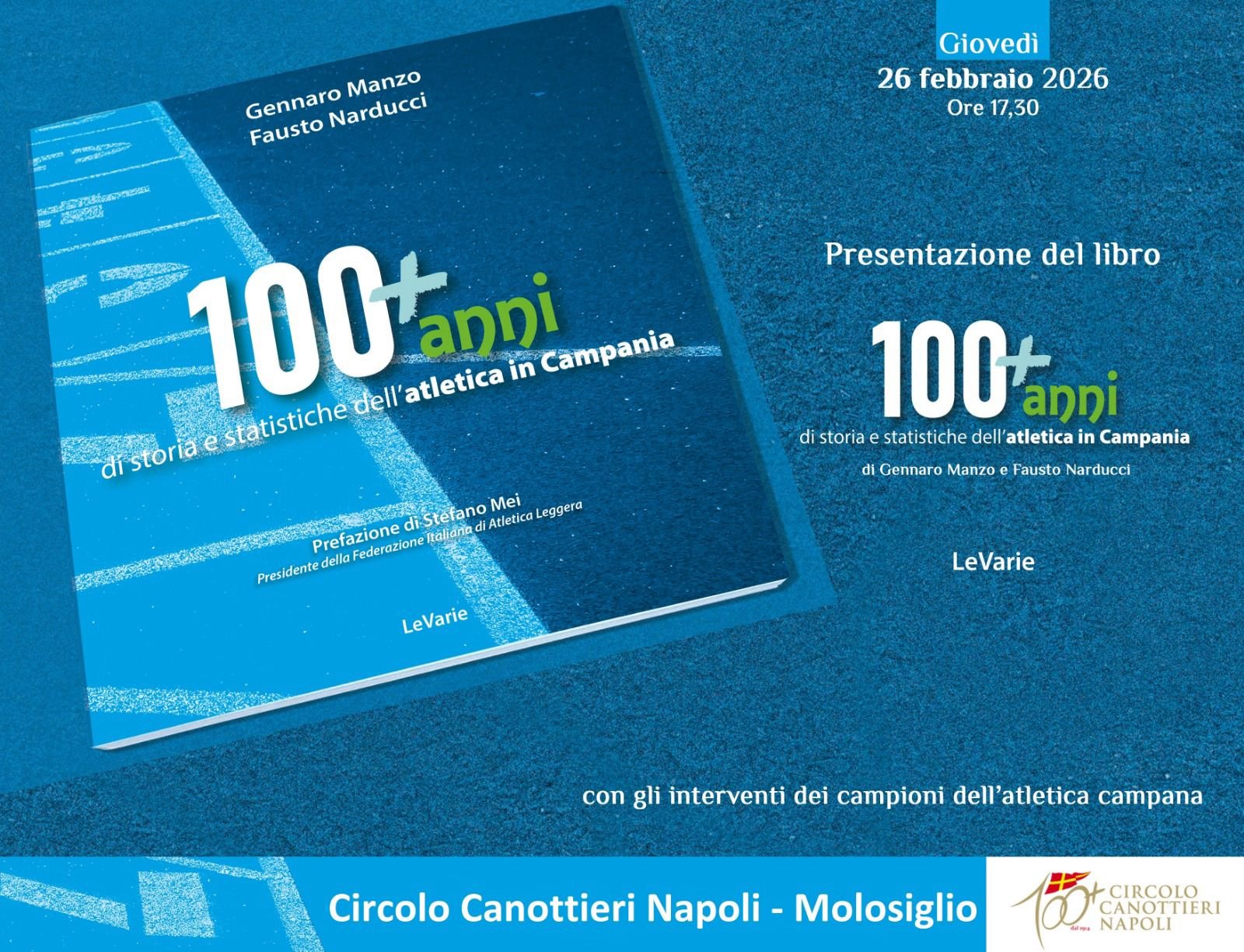 Giovedì 26 febbraio alle ore 17,30, al Circolo Canottieri Napoli, presentazione di “100+anni di storia e statistiche dell’atletica in Campania”, il primo libro dedicato completamente ai racconti, ai protagonisti e alle statistiche dell’atletica leggera nella nostra regione, da fine Ottocento al 2025. Il volume è stato scritto da Rino Manzo, già dirigente sportivo di lungo corso e Stella d’oro del Coni, e da Fausto Narducci, già redattore capo della Gazzetta dello Sport, con la prefazione di Stefano Mei, presidente nazionale della Federazione Italiana dell’Atletica Leggera (FIDAL) ed edito da LeVarie edizioni. Testimonial della presentazione sarà la campionessa europea dei 5000 metri Maria Guida. Interverranno campioni e atleti del passato e del presente dell’atletica leggera della Campania. Nell’ambito della presentazione la Fidal Campania ha organizzato le premiazioni degli atleti della nostra regione che si sono distinti nei risultati e nelle prestazioni della stagione agonistica 2025.