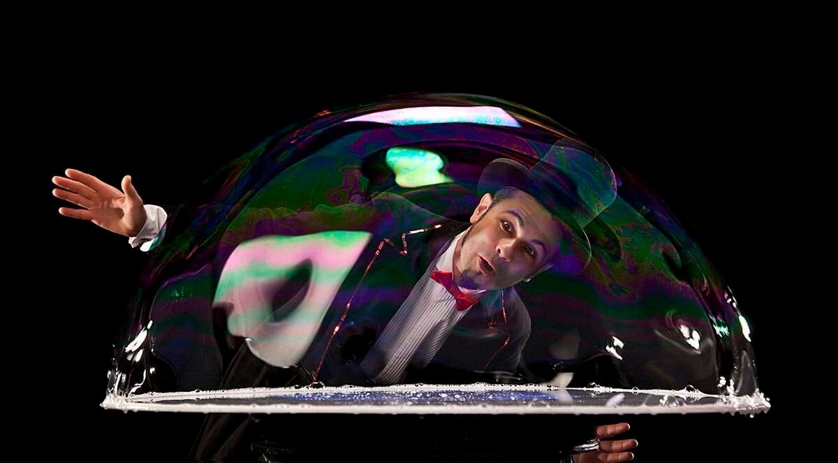 Un eccentrico direttore d’orchestra – o meglio, un direttore “senza orchestra”, senza strumenti e perfino senza fiato – conquista il pubblico con un “concerto” dove l’imprevisto diventa protagonista. Tra gag sorprendenti e poesia visiva, da strani strumenti prendono vita bolle giganti, bolle rimbalzine, grappoli di bolle e creature trasparenti e colorate, fragili come sogni che si librano nell’aria.