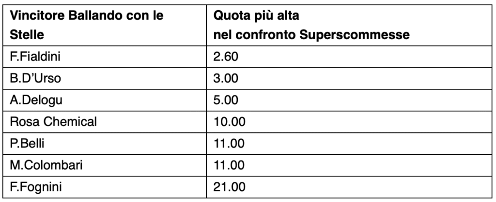 Di seguito le quote attribuite ai concorrenti di Ballando con le Stelle 2025 maggiormente favoriti per la vittoria finale: