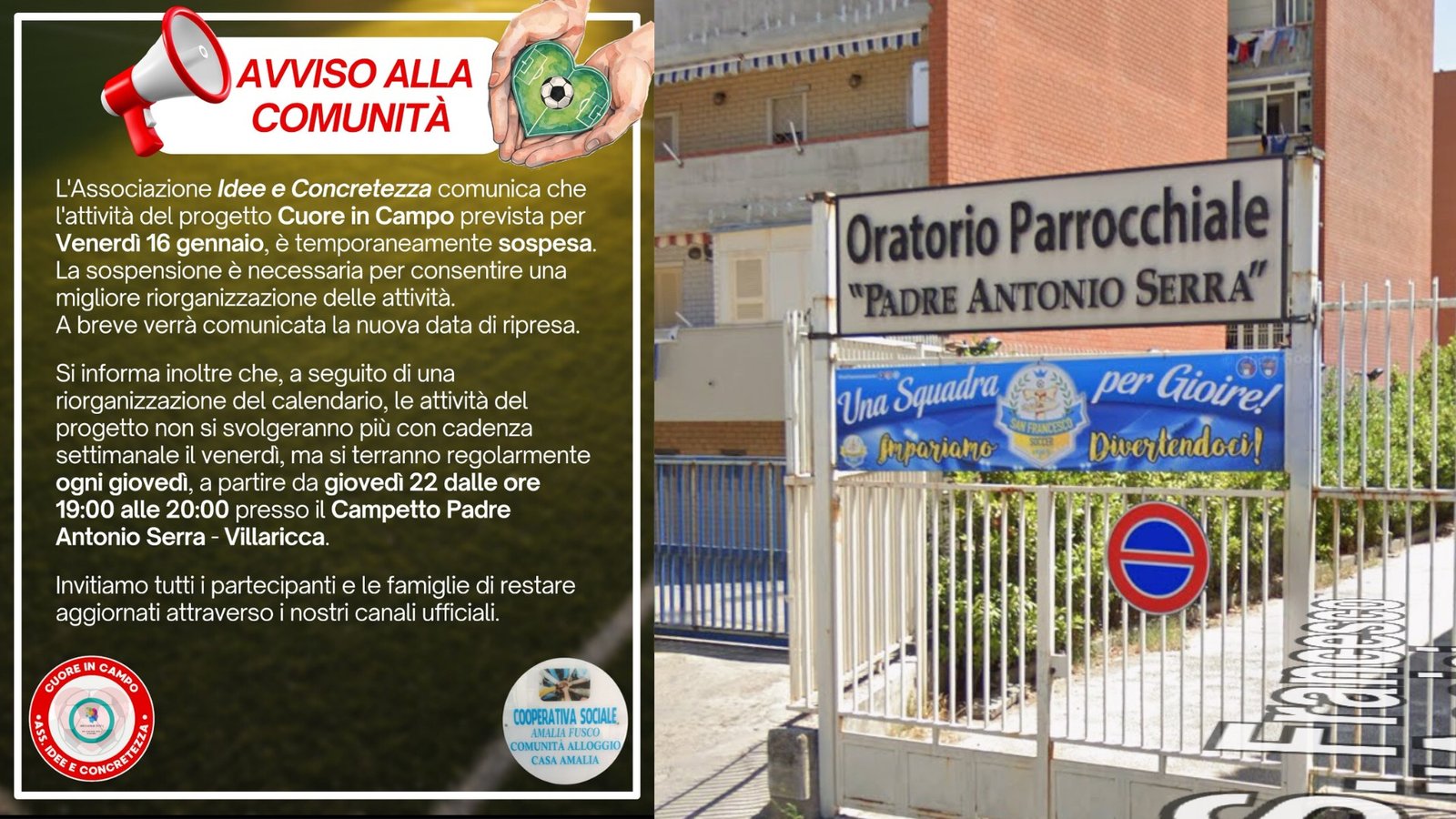L’Associazione Idee e Concretezza comunica che l’attività del progetto Cuore in Campo, prevista per venerdì 16 gennaio, è temporaneamente sospesa per consentire una migliore riorganizzazione delle attività.